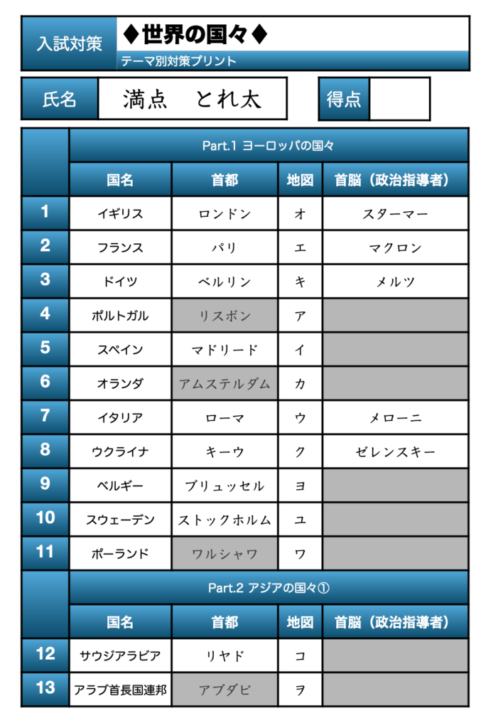 今回のテーマは「世界の国々」地図問題です。サミット国や日本と関連が深い国は、首都や政治指導者も問題にしてみました。